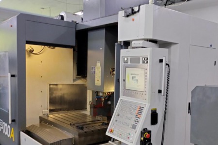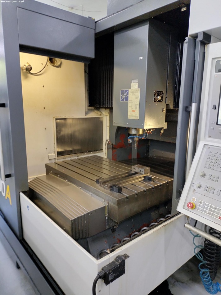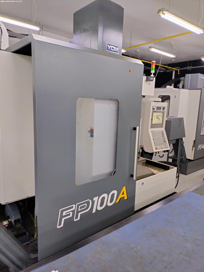 Specyfikacja techniczna frezarki CNC YCM FP100A posuw w osi X/Y/Z: 1020/710/460 mm posuw przyśpieszony w osiach X,Y,Z: 20 m/min prędkość posuwu roboczego: 1-20000 mm/min wymiary stołu roboczego maszyny (dł. x szer.): 1200 x 700 mm maksymalny ciężar detalu: 1000 kg maksymalna prędkość obrotowa wrzeciona: 16000 obr/min stożek wrzeciona: HSK A63 moc napędu wrzeciona: 22,5 kW moment obrotowy wrzeciona: 126 Nm maksymalna średnica narzędzia: 76 mm maksymalna średnica narzędzia (przy wolnych sąsiednich miejscach): 100 mm Wyposażenie centrum frezerskiego FP100A sterownik CNC: HEIDENHAIN iTNC 530 30-pozycyjny magazyn z automatyczną wymianą narzędzi sonda stykowa do detali: HEIDENHAIN TS640 liniały optyczne HEIDENHAIN w osiach X,Y,Z prowadnice rolkowe IKO we wszystkich osiach liniowych