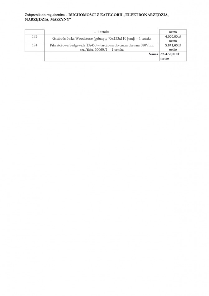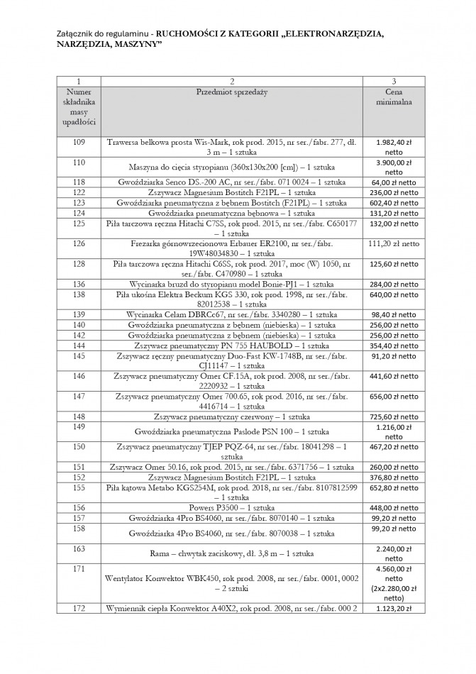 Syndyk masy upadłości Moderndach sp. z o.o. w upadłości z siedzibą w Łochocinie sprzeda elektronarzędzia, narzędzia, maszyny. Dokładny wykaz znajduje się w fotografiach. Możliwość zakupu pojedynczych pozycji. Lokalizacja: Łochocin (woj. kuj-pom). Termin składania ofert: 7 lipca 2025 roku. Faktura VAT. Regulamin sprzedaży dostępny mailowo.