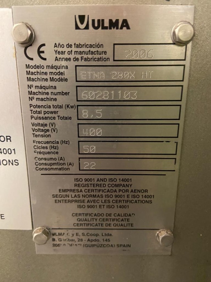 Na sprzedaż oferuję pionową maszynę pakującą typu STABILO – ULMA ETNA 280X HT, przeznaczoną do formowania stabilnych opakowań z czterema zgrzewami pionowymi. Urządzenie znajduje się w bardzo dobrym stanie technicznym i było użytkowane w ograniczonym zakresie – całkowity czas pracy wynosi jedynie 1837 godzin.