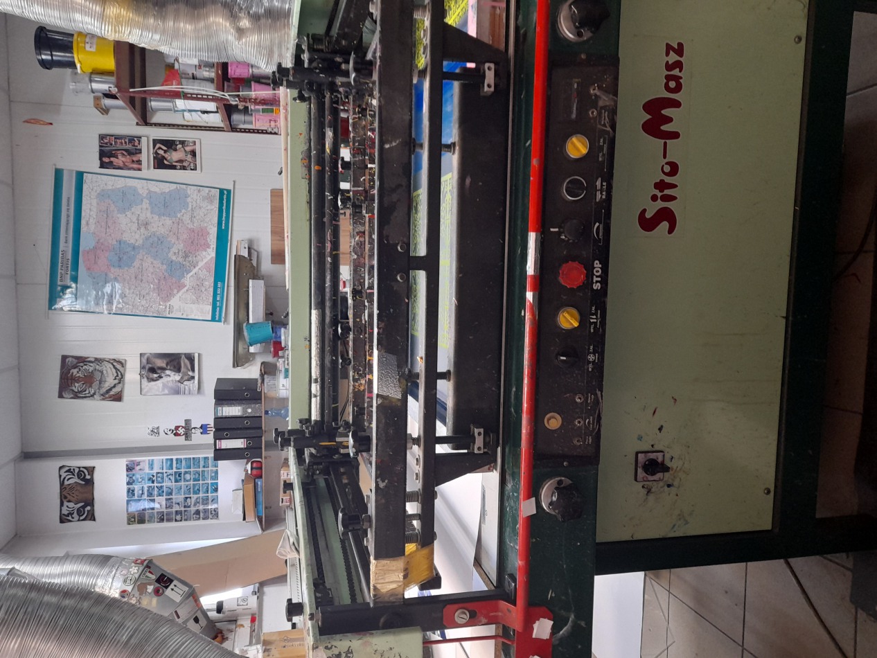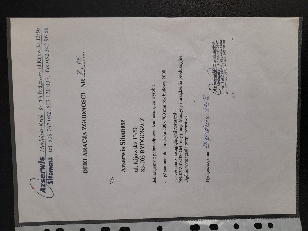 Maksymalne pole zadruku: 500 x 700 mm. Wymiary: 900 x 1000 x 1100 mm. Zasilanie: 3 x 400 V Cena zakupu: 25 000,00 zł. netto Do dnia 23.06.2025 można obejrzeć maszynę w czasie pracy. Bezawaryjny półautomat wyprodukowana prze znana polską firmę. Cały czas w produkcji.