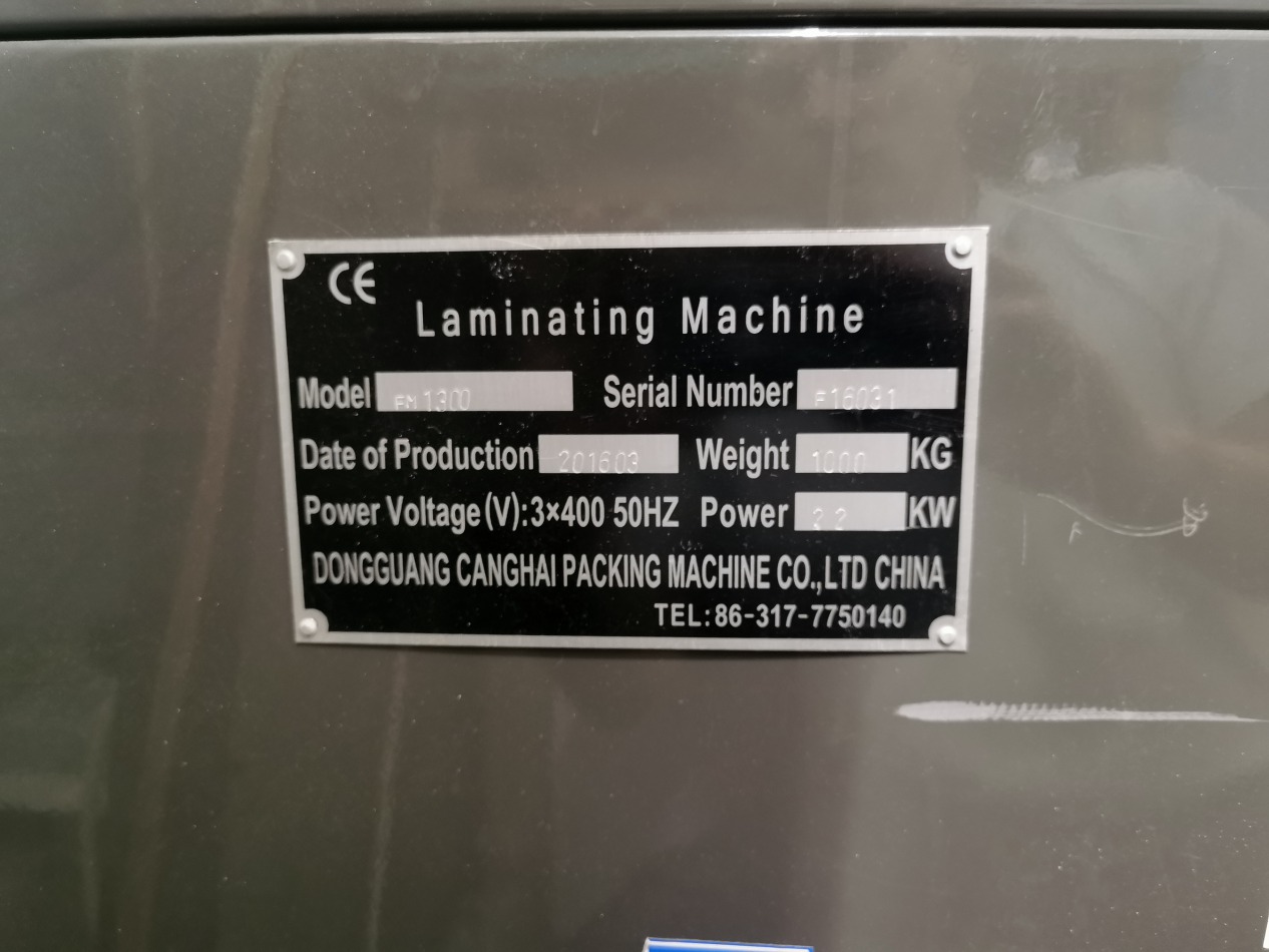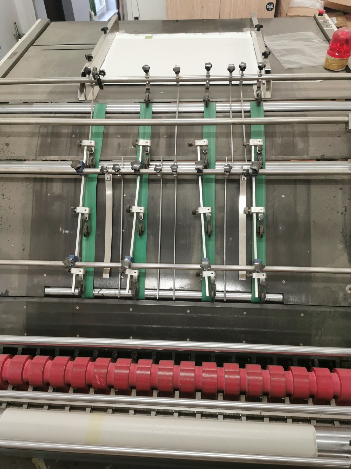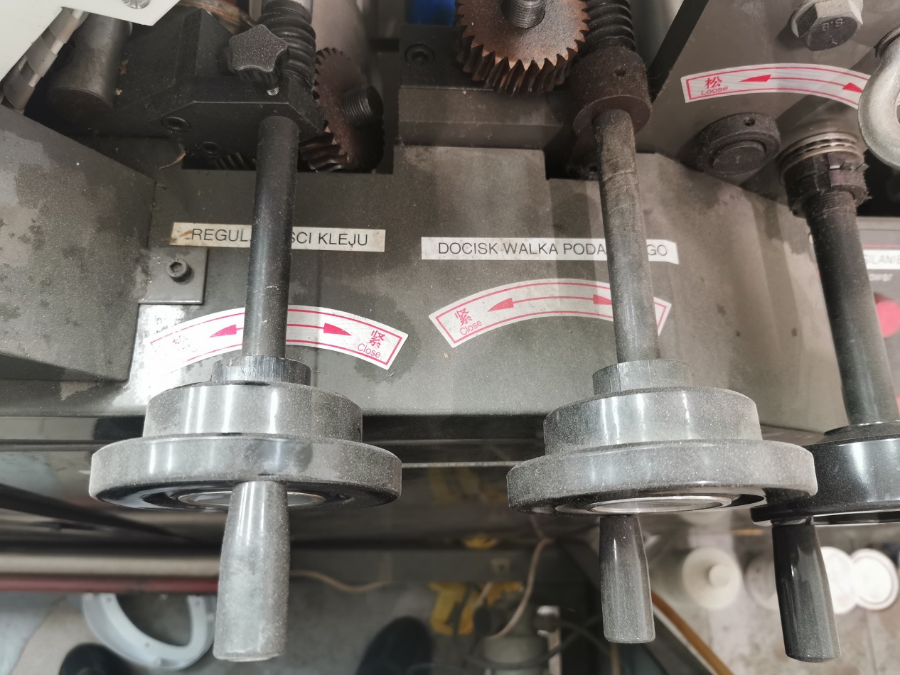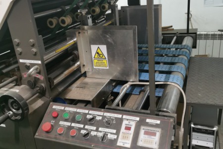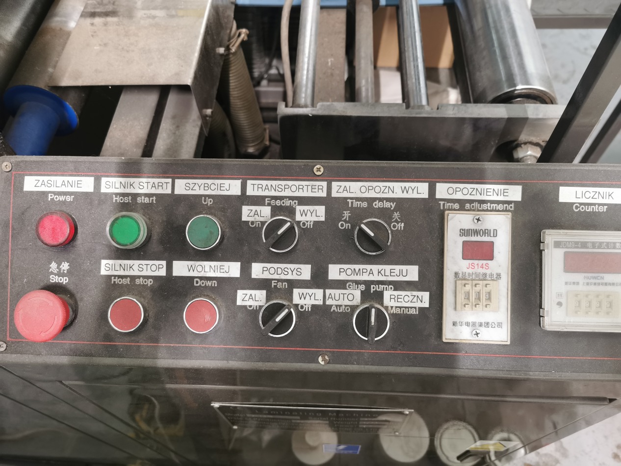 Półautomat do kaszerowania MZC-K1300 2016 rok Maszyna do oklejania tektury litej i falistej (fala E,B,C,BE i BC) arkuszami papieru z nadrukiem o gr.pow.150 gr/m2. Ręczne podawanie oklejki i automatyczne podawanie tektury. Maksymalny rozmiar tektury 1300 x 1500 mm. Minimalny 320 x 450 mm. Szybkość od 0-90m/min