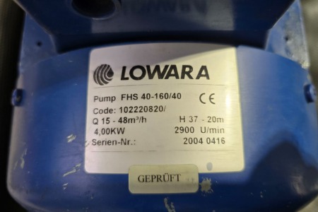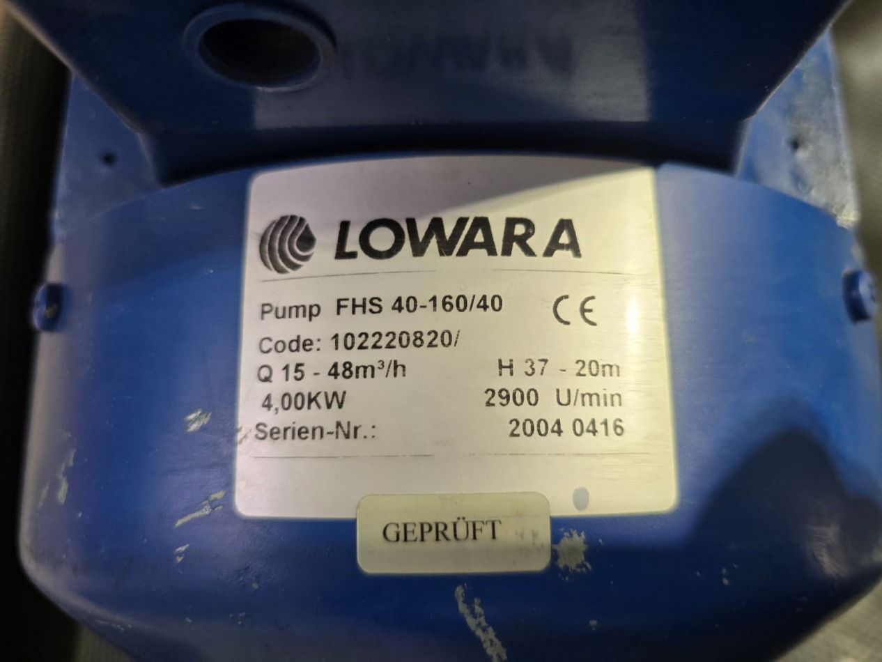 Przedmiotem sprzedaży jest nieużywana pompa marki LOWARA. Typ: FHS 40-160/40. Wydajność: 38 m3/h. Silnik o mocy: 4 kW.