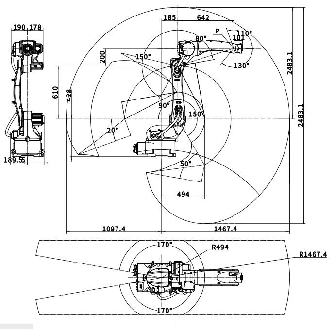 6-osiowe ramię o dużym zasięgu: od 1468 mm do 2093 mm (w zależności od modelu)