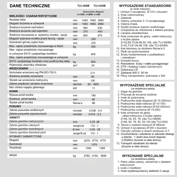 Duża moc silnika napędowego oraz sztywna budowa maszyny, pozwalają na toczenie narzędziami ze stali szybkotnącej, narzędziami z węglików spiekanych oraz narzędziami z płytkami ceramicznymi. W tokarce TUJ-560M i TUJ-630M są zastosowane sprzęgła i luzownik elektromagnetyczny.