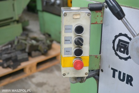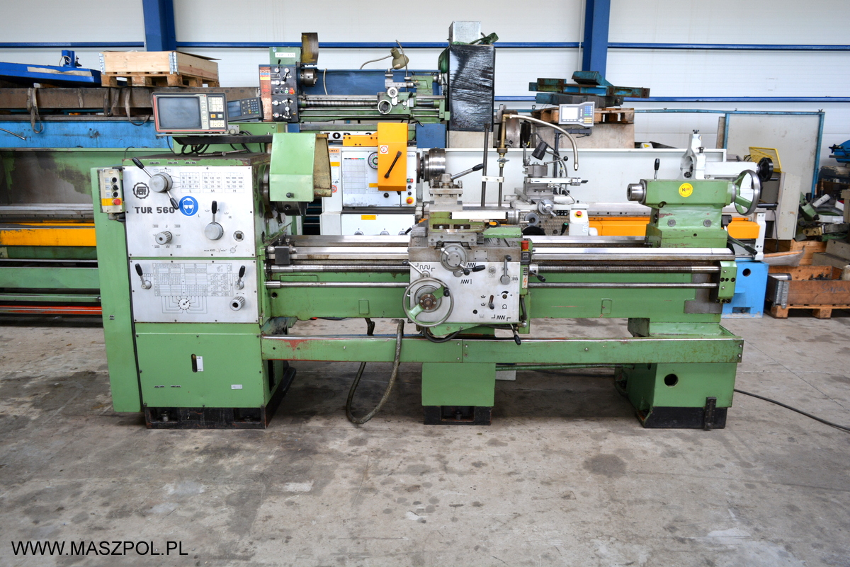 Tokarka uniwersalna TUR 560 x 1500 FAT WROCŁAW . STAN TECHNICZNY BARDZO DOBRY - WERSJA EXPORTOWA . ZOBACZ FILM PRACE MASZYNY SKOPIUJ PONIŻSZY LINK I WKLEJ DO PASKA ADRESU LUB DO WYSZUKIWARKI INTERNETOWEJ: . youtube.com/watch?v=Bu7qkw7Idhg . Maszyna posiada hartowane łoże , odczyty FAGOR , przyspieszone posuwy , uchwyt 3-szczękowy z niezależnymi szczękami , układ chłodzenia , dokumentacja techniczno-ruchowa DTR. . Na tokarce można nacinać wszystkie ważniejsze gwinty metryczne, calowe, modułowe i diamentral Pitch, prawo i lewo zwojne. Prowadnice łoża są hartowane. Tokarka posiada szybki przesuw suportu wzdłużnego i poprzecznego co wpływa na sprawniejsze i ekonomiczniejsze wykorzystanie tokarki , hartowane prowadnice . . Dane Techniczne: . - maksymalna średnica toczenia : . - nad łożem 560 mm
