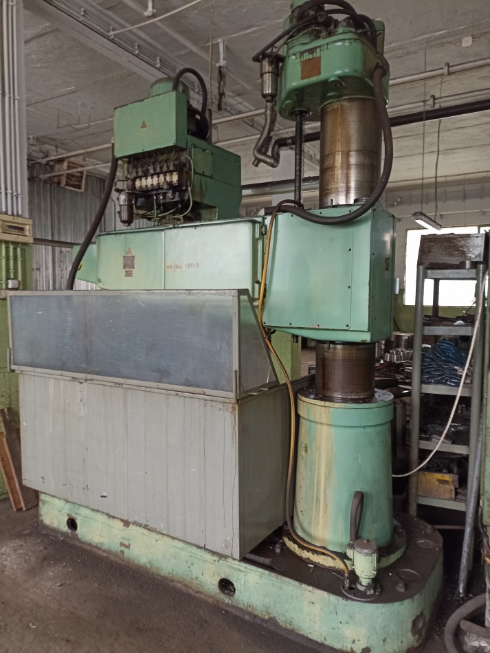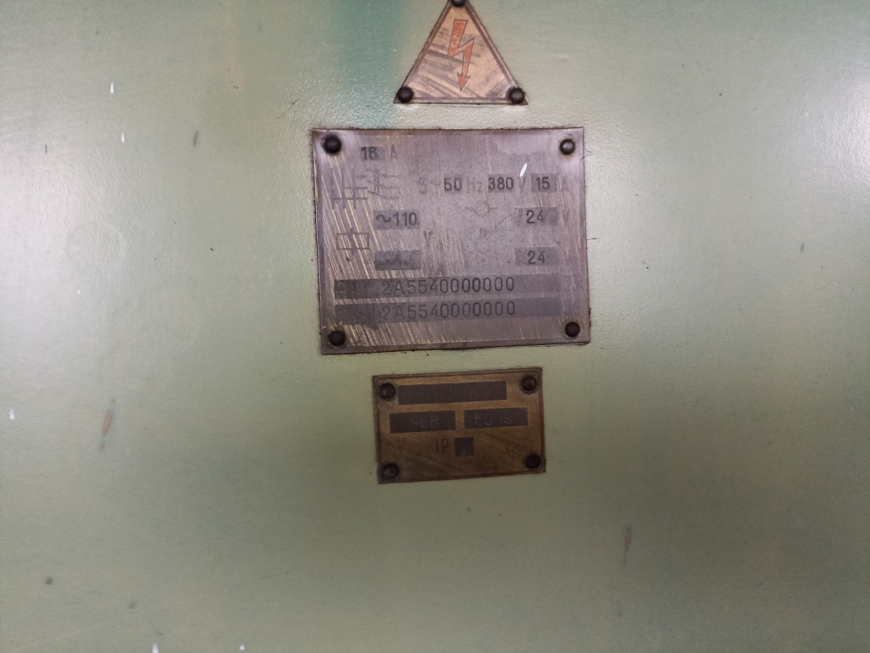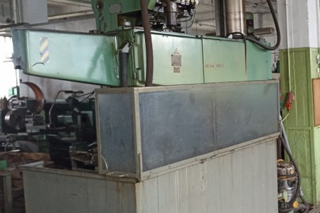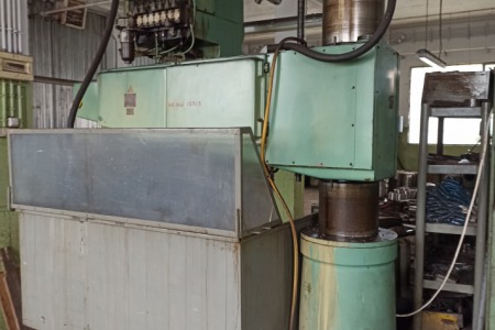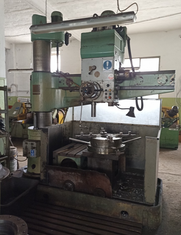 Wiertarka promieniowa STANKOIMPORT typ 2A554 wyprodukowana w 1988 roku w ZSRR. Podstawowe dane techniczne: Maksymalna średnica wiercenia w stali C45 - 50 mm Stożek wrzeciona Morse,a – 5 Średnica pinoli 90 mm Wysuw pinoli 400 mm Zakresy prędkości obrotowych wrzeciona – 18-2000 obr/min Liczba stopni prędkości obrotowych wrzeciona - 24 Odległość między czołem wrzeciona i powierzchnią roboczą stołu: maksymalna - 1600 mm minimalna - 450 mm Największe przesunięcie wrzeciennika wzdłuż ramienia - 1225 mm Maksymalne przesunięcie pionowe ramienia wzdłuż płaszcza - 750 mm Moc silników wiertarki - 9KW Wymiary wiertarki w przybliżeniu: długość - 2850 mm szerokość - 1030 mm wysokość - 3430 mm Masa netto - 4700 kg Istnieje możliwość wykonania próbnego wiercenia.