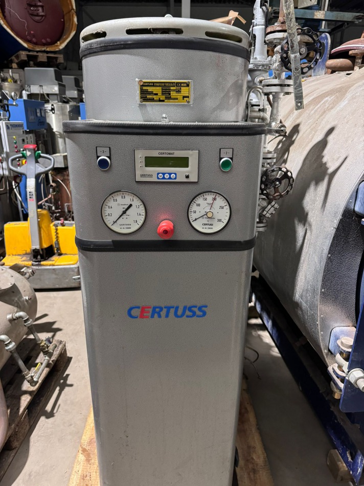 Specyfikacja: Wytwornica pary Certuss Wydajność pary 200 kg Zasilanie - gaz Ciśnienie robocze 10 bar Pompa zasilająca Speck Zbiornik wody zasilającej ze stali nierdzewnej.