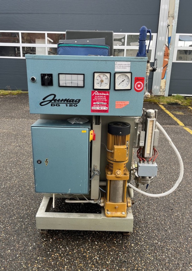 Specyfikacja: Wytwornica pary Jumag DG 120 Palnik olejowy Pompa zasilająca Ciśnienie robocze 13 bar Wydajność 120 kg